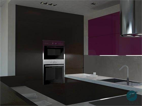 Materiały: fronty fornir wenge + lakierowany połysk, frezowany podchwyt, blat z laminatu, okładziny ścienne ze szkła.
